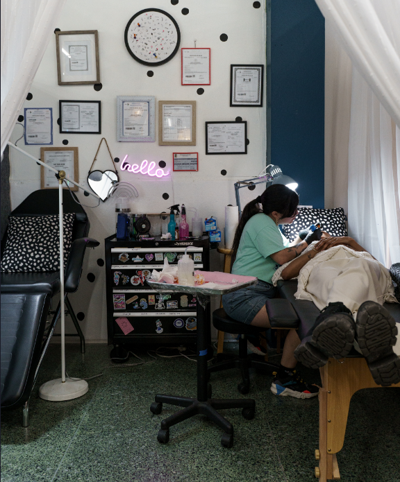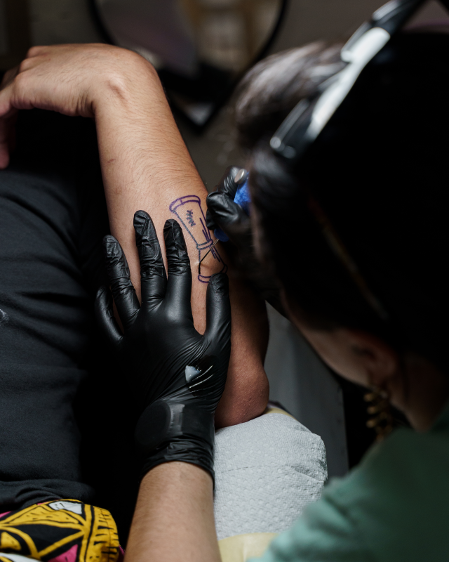 Hola! Soy Alexandra, conocí el arte mediante el graffiti a mis 16 años bajo el tag de FEM, y desde entonces me inspira la letra, las flores y las lineas gruesas y fluidas. El tatuaje me permite hacer eso en menor escala, y me encanta. Me envuelvo y disfruto mucho en los procesos, y el stick and poke no es la excepción.